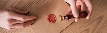 partial view of notary holding stamper near envelope with wax seal on wooden desk, banner