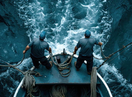 Fishermen work diligently under stormy skies, handling ropes and nets on a fishing vessel. The scene captures the essence of marine industry and teamwork while enduring challenging weather.