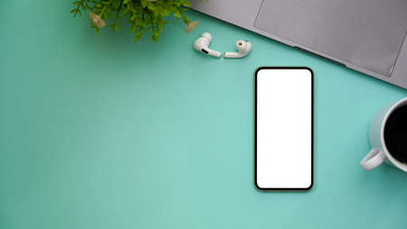 Trendy light green workspace background with smartphone white empty screen mockup, earbuds, cup of coffee, laptop, decor plant and copy space. top view, flat lay