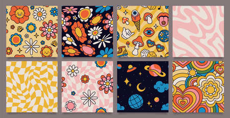 Retro 70s psychedelic seamless patterns, groovy hippie backgrounds. Cartoon funky print with flowers and mushrooms, hippy pattern vector set. Cosmos with ufo spaceship and stars, floral design