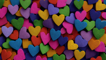 A bunch of colorful hearts are scattered around in a pattern. The hearts are of different sizes and colors, creating a vibrant and lively atmosphere. Concept of joy and celebration
