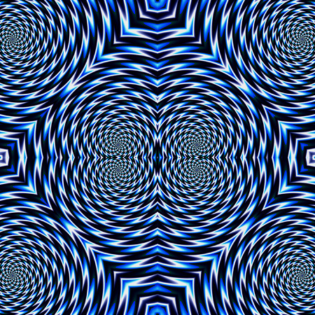 Abstract psychedelic rotating blue background of concentric circular shapes. Blue and white abstract rotating and vibrating pattern