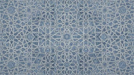 A detailed and intricate Islamic geometric pattern fills the frame with repeating star and polygon shapes in blue and white tones.