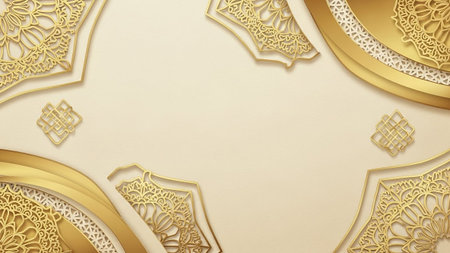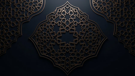 Exquisite gold Islamic patterns adorn a dark textured backdrop, exuding elegance. Islamic Arabic Arabesque Ornament Border Luxury Abstract black Background with Copy Space
