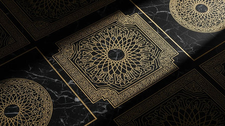 Golden Islamic geometric patterns are set on a black marble floor, with dramatic lighting casting shadows, creating a luxurious and ornate visual.
