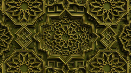 A detailed, layered geometric Islamic pattern featuring star motifs in shades of olive green and gold, creating a sense of depth.