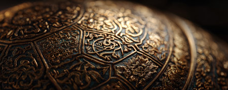 Close-up of an ornate metallic surface with intricate engravings and patterns, highlighting the craftsmanship and artistic details in a rich texture and design