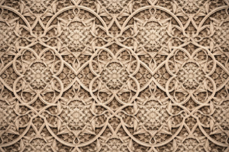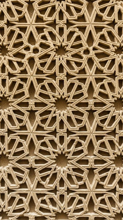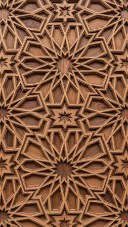Detailed patterns created from wood show a skillful design, filling the space with a rich texture and repeated shapes in a warm color.