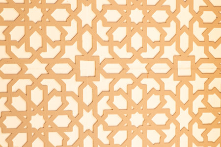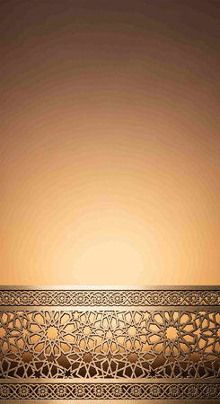 Background design based on traditional oriental graphic motifs. Islamic decorative pattern with golden artistic texture. Arabian ethnic mosaic with interlacing lines and geometric tiled ornaments.