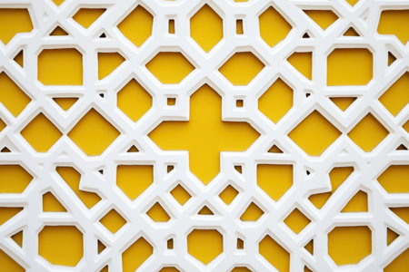 A detailed close-up of a white, repeating geometric lattice pattern against a vibrant yellow backdrop, showcasing intricate Islamic-inspired design.