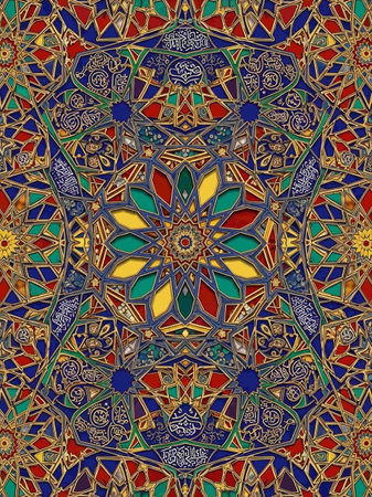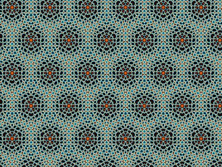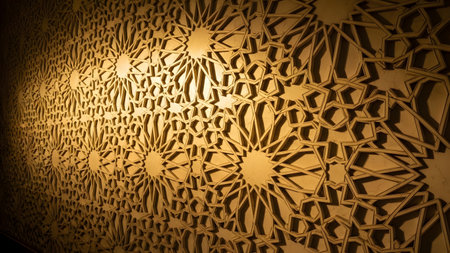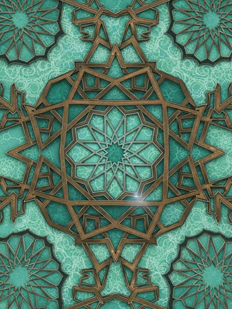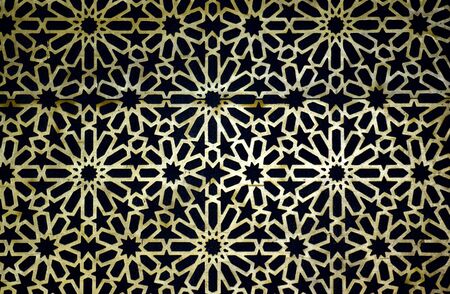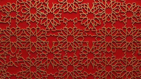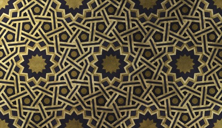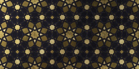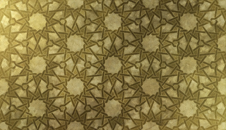 Background design illustration based on traditional oriental graphic motifs. Islamic decorative pattern with golden artistic texture. Arabian ethnic mosaic with interlacing lines and geometric tiled ornaments.