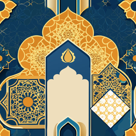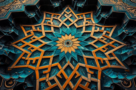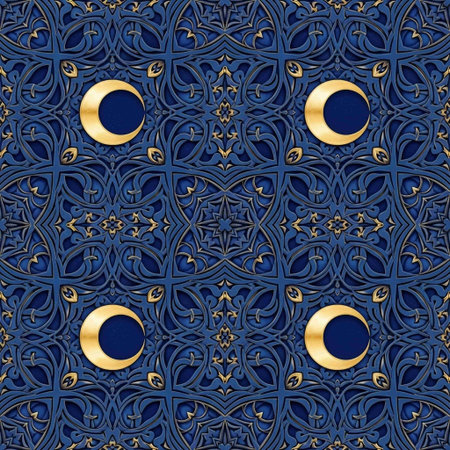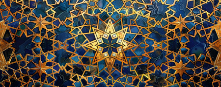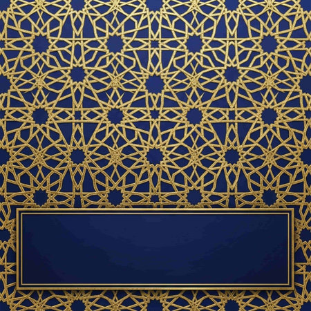 Elegant showing intricate golden islamic geometric pattern on dark blue background keywords: islamic pattern, geometric pattern, arabesque,...
