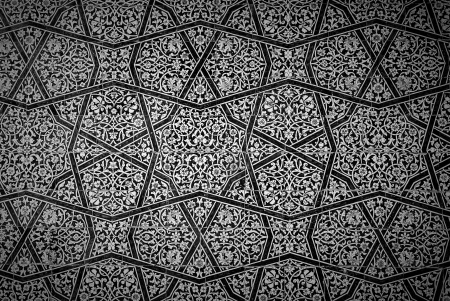 A dark, intricate geometric Islamic pattern with sharp lines and subtle light creates a sense of depth and shadow.