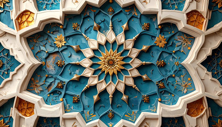 A close-up view of a multi-layered, three-dimensional Islamic geometric star pattern with intricate carvings in blue, gold, and orange, exhibiting depth and shadow.