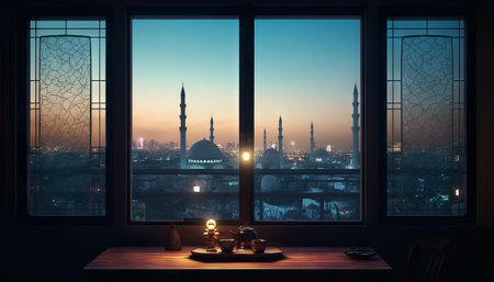 image of a window with a view of a city skyline, with a mosque lit up in the distance to celebrate Eid al-Fitr
