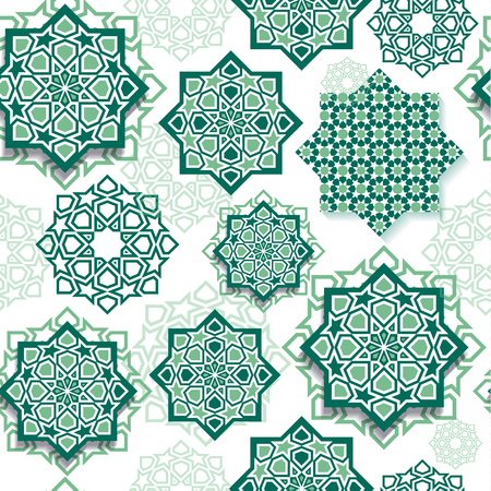 Seamless symmetrical abstract vector background in arabian style made of emboss geometric shapes with shadow. Islamic traditional pattern. White color.