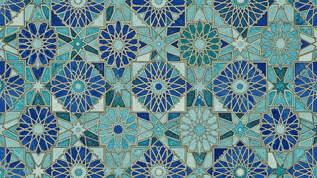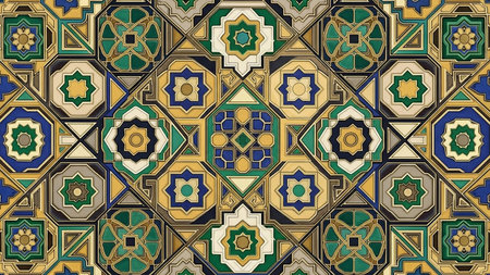 A complex geometric mosaic pattern featuring intricate star and square motifs in blue, green, gold, and white, reminiscent of Islamic architectural