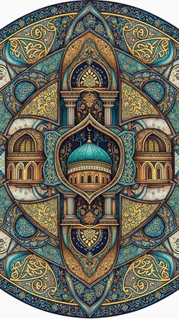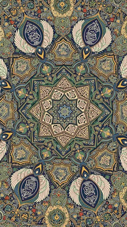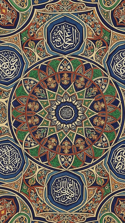 A vibrant and intricate Islamic geometric mandala pattern featuring Arabic calligraphy, with a rich palette of blue, green, red, and white.