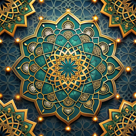 Geometric background with intricate, tessellated star patterns in gold and blue.