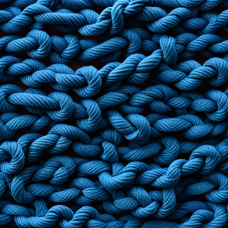 Close-up shot of vibrant ropes knotted together creating a colorful grid pattern, showcasing texture.