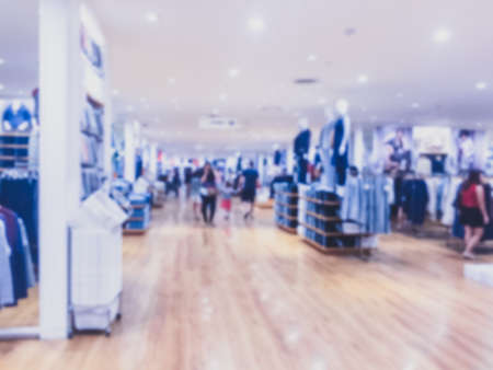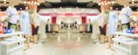 Abstract blurred of fashion clothes shop boutique interior in a shopping mall, with bokeh light background.