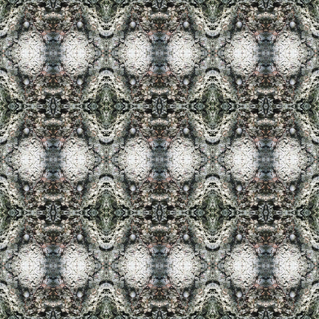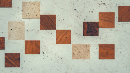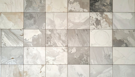 A detailed pattern of square tiles featuring marbled stone effects and distressed paint textures in a palette of...