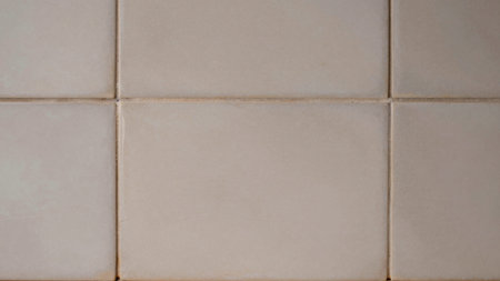 View of a beige ceramic tile wall composed of nine square tiles arranged in a.