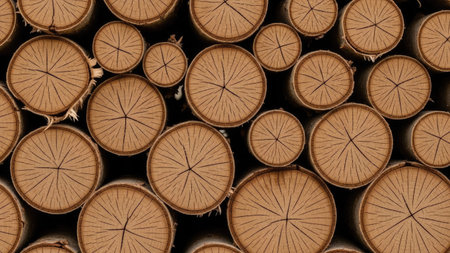 Overhead view of numerous freshly cut tree logs stacked in a pattern, showcasing the natural wood grain and cut marks of each log.. AI Generation