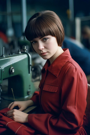 Generative AI illustration of A young woman works with bangs at a garments factory among machine tools sewing clothes. fashion concept