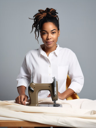 A woman sitting at a sewing machine, focused on stitching fabric with precision, Focused female tailor sewing on machine in atelier, AI Generated
