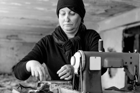 Senior seamstress woman working with clothing item on a sewing machine