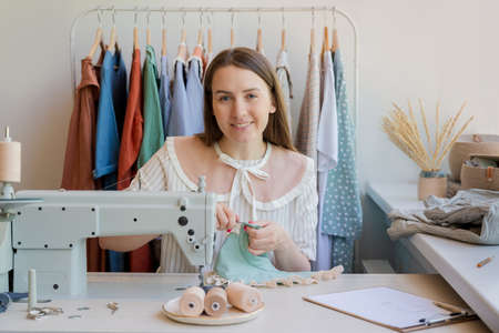 Portrait of young dressmaker looking at camera while sitting at the table with sewing machine thread and pieces of fabric in the workshop
