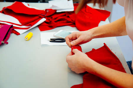 Close up women's hands of seamstress at work with tissue fabric