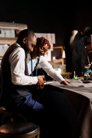 Experienced suitmakers manufacturing bespoke sartorial clothing in upscale atelier studio. Skilled fashion designers meticulously cutting fabric material for customer comissioned stylish outfit