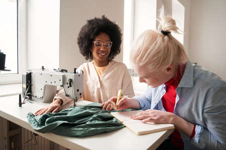 Multiracial seamstress holding textile for dress production and eco re sewing