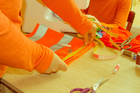 Woman tailor working on a clothing sewing stitching measuring fa
