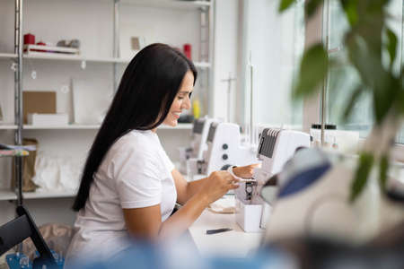 Shop for tailoring. A woman creates clothes on a sewing machine. fashion industry for people. Stylish fashionista woman creating new cloth design collection. Tailor and sewing. People lifestyle and occupation concept.
