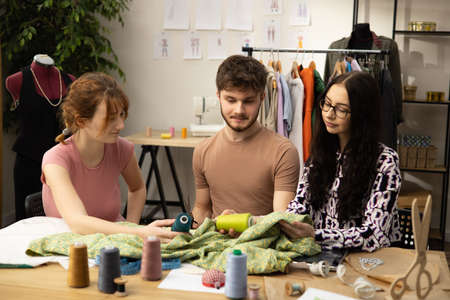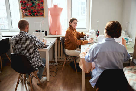 Young confident seamstress consulting her colleagues about some details