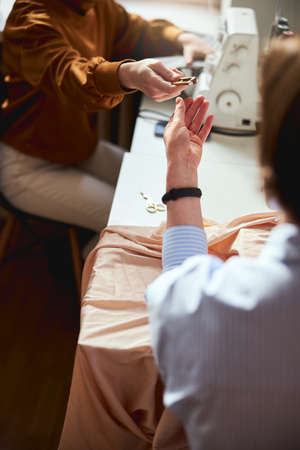 Person passing a thread cutter to seamstress
