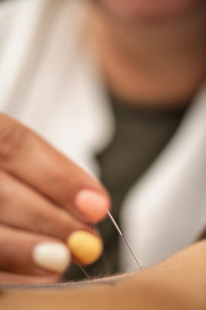 Man using acupuncture treatment for pain relief. Chinese alternative medicine