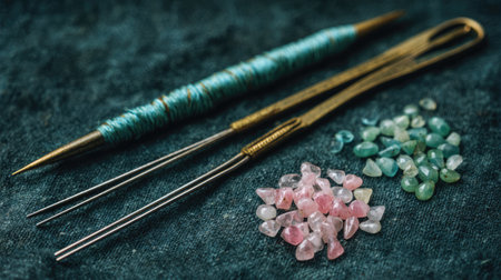 This image features sewing tools including needles and threads alongside vibrant gemstones on a textured surface, ideal for craft and design inspiration.