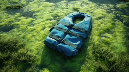 A bright blue life jacket rests on lush green marsh grass, surrounded by calm waters. This serene scene captures the essence of water safety and adventure.
