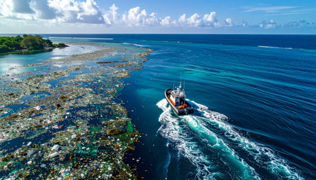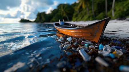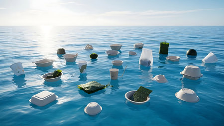 Bright plastic debris rests on the surface of the deep blue ocean, showing the critical issue of marine pollution affecting ecosystems.
