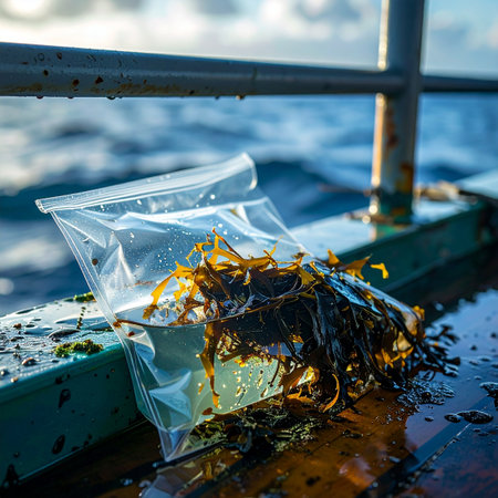 A freshly collected seaweed specimen sits in a clear sample bag on the wet deck of a research vessel.