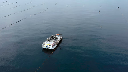 An image of fishing nets floating in the sea, in search of a catch, marine life and the labor of sailors in a huge blue distance.