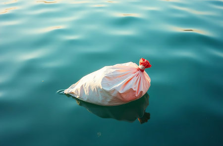 AI Generative Plastic garbage bag floats on ocean surface, waste drifts in water