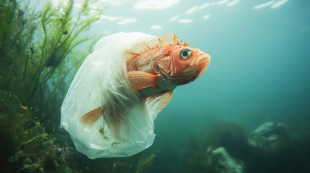 An underwater scene captures a vibrant fish caught in a plastic bag, raising awareness about marine pollution and the urgent need for environmental conservation efforts.