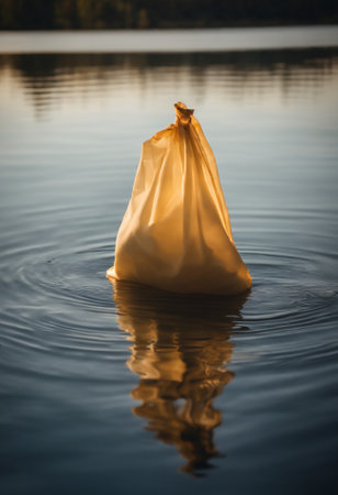 Yellow plastic bag floating on the water. The concept of environmental pollution.