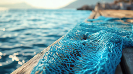 A close-up view of a blue fishing net draped on a wooden dock, with the serene ocean in the background and soft sunlight illuminating the scene. Concept: Fishing Net, Wooden Dock, Serene Ocean View