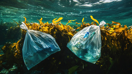 An underwater view revealing plastic waste entangled in seaweed, highlighting the urgent need for marine conservation and pollution awareness in ocean ecosystems.